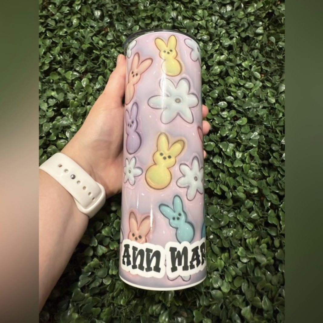 Puffy Peeps Tumbler, 20 oz, can add a name to personalize. Comes with a splashproof lid and reusable straw.